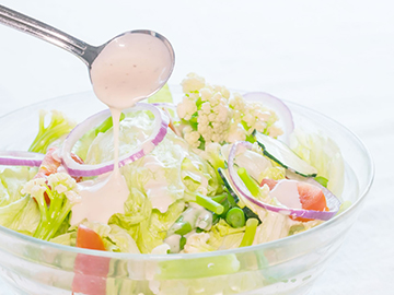 また、マヨネーズよりもさらにモモの風味を強く打ち出したのが、「岡山白桃ドレッシング(ノンオイル)」。白桃を贅沢に70%使用し、酸味もスパイス感も控えめに仕上げたこの品は、ドレッシングでありながらもフルーツソースのよう。甘味のある芳醇な味わいが、生ハムやチーズなど塩気のきいた食材によく合います。