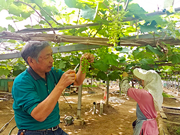 今から100年近く前、岡山のブドウの本場、岡山市北区御津でマスカット・オブ・アレキサンドリアの生産を始めた果樹農園。現在は、シャインマスカット、桃太郎ぶどう、紫苑などのさまざまな新品種ブドウの栽培も手がけています。また1984(昭和59)年には「大内園芸」を立ち上げ、シンビジューム、胡蝶蘭などの生産もスタート。毎年12月に農園で開催する洋蘭フェアには、関西や広島をはじめ全国の洋蘭ファンが訪れています。また、さらなる多品種営農を目指して1994(平成6)年に有限会社スコレーを設立。21世紀に入りドラゴンフルーツの栽培に着手し、2012(平成24)年には国の六次産業化法に基づく総合化事業計画の認定を受け、「おかやま果実」のフルーツカレーシリーズなどさまざまな農産加工品づくりに取り組んでいます。