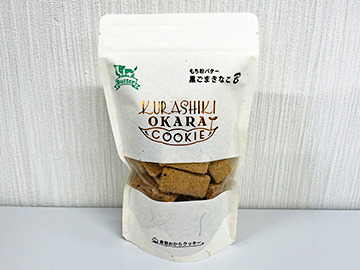 メイン材料は、地元豆腐店から毎朝届く、100%国産大豆の搾りたて「生おから」。たんぱく質、カルシウム、食物繊維が豊富なおからは、低カロリーながら満腹感があり、日々のカロリーコントロールにも最適です。おからを生のまま生地に練り込むことで食物繊維が壊れにくく、油分控えめでもサクサクの食感が実現。水分量が毎回違うおからを生の状態で使うには、焼く時間や材料の細やかな調整が毎回必要なことから、ほとんど手作業で製造されています。味は50種以上。食べ飽きない優しい甘さも幅広い層に喜ばれています。そのままプレゼントにも使えるように、「倉敷おからクッキー」のパッケージは全体的にシンプルで上品なデザインになっています。
